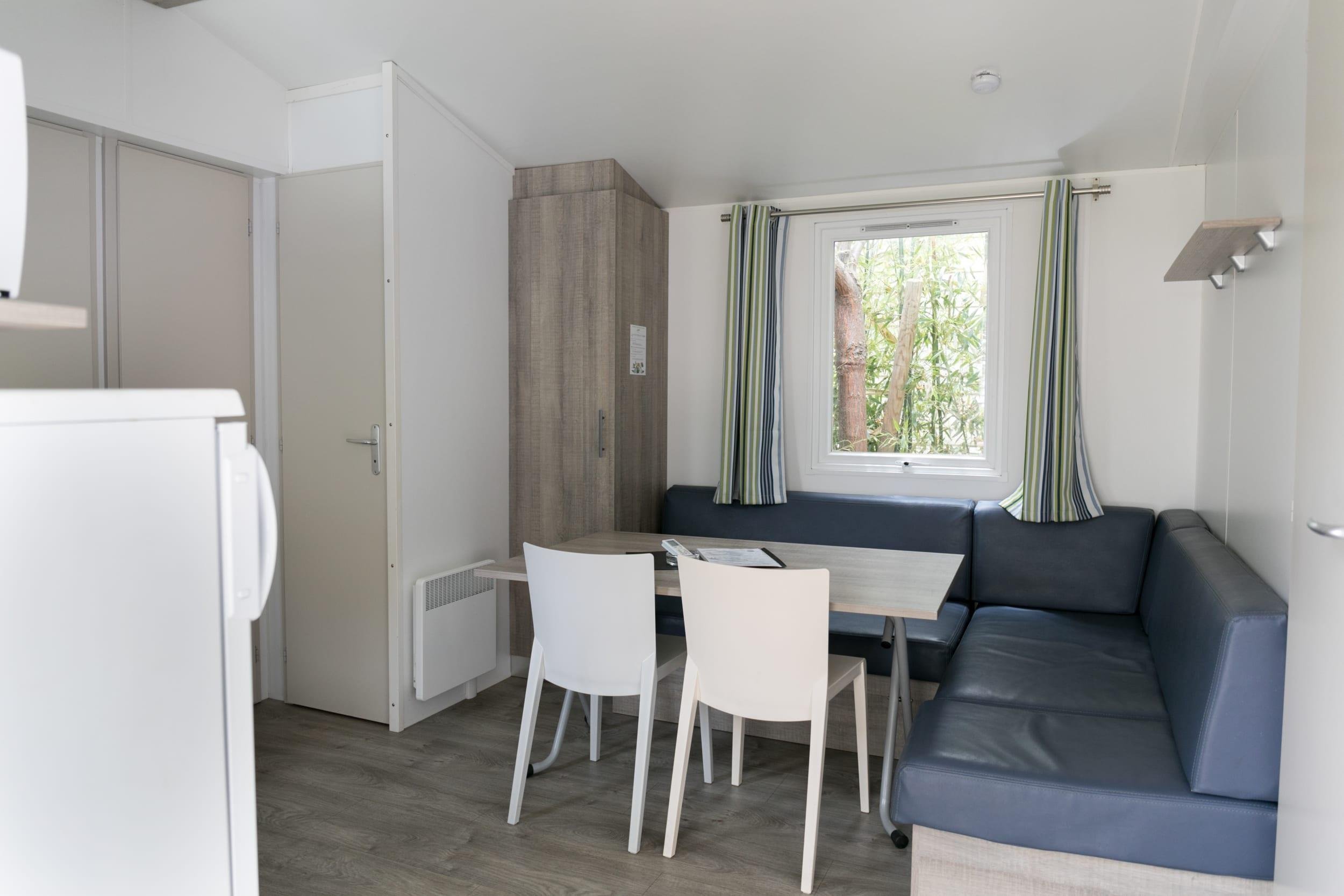 Wohnbereich: das Mobilheim verfügt über einen Wohnbereich mit einer komplett ausgestatteten Küche (mit einem Herd, Kombi-Mikrowellenofen und Kühlschrank mit Gefrierfach) und einer Sitzecke (kann als Schlafplatz für die fünfte Person verwendet werden).