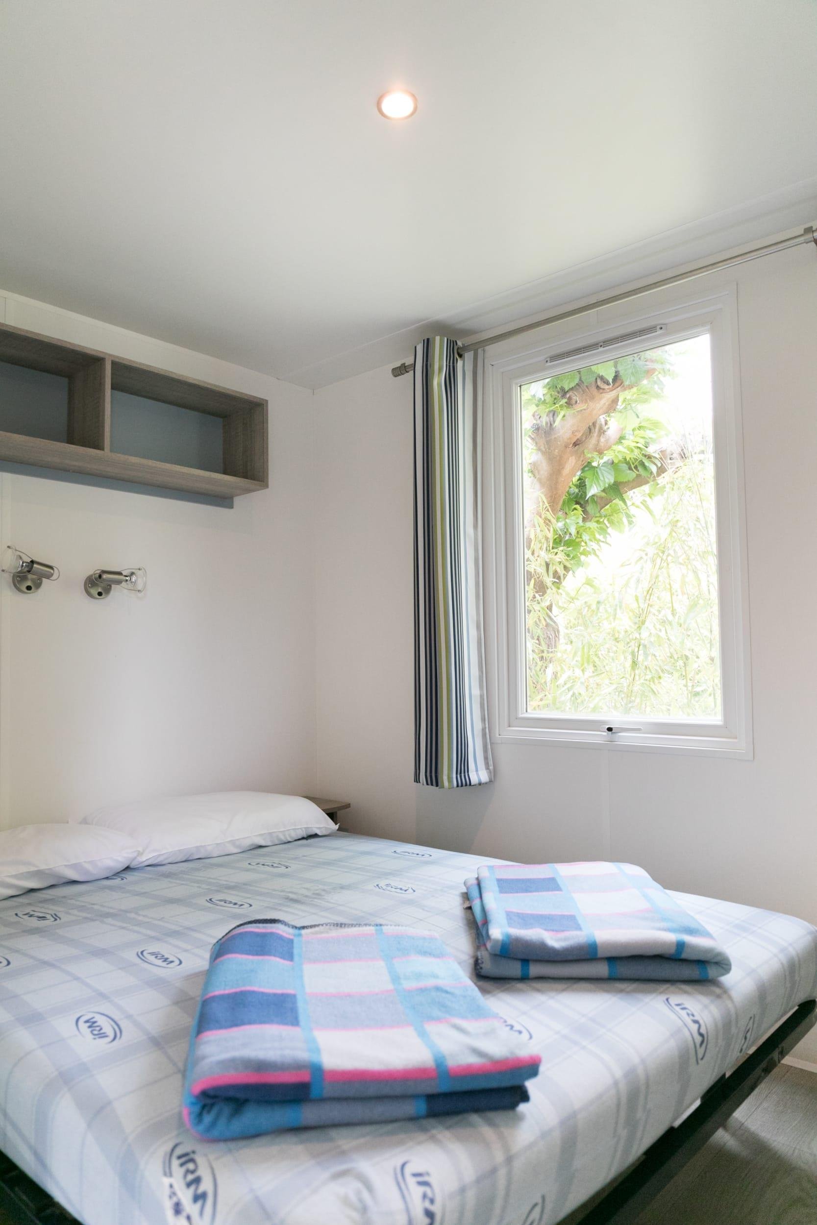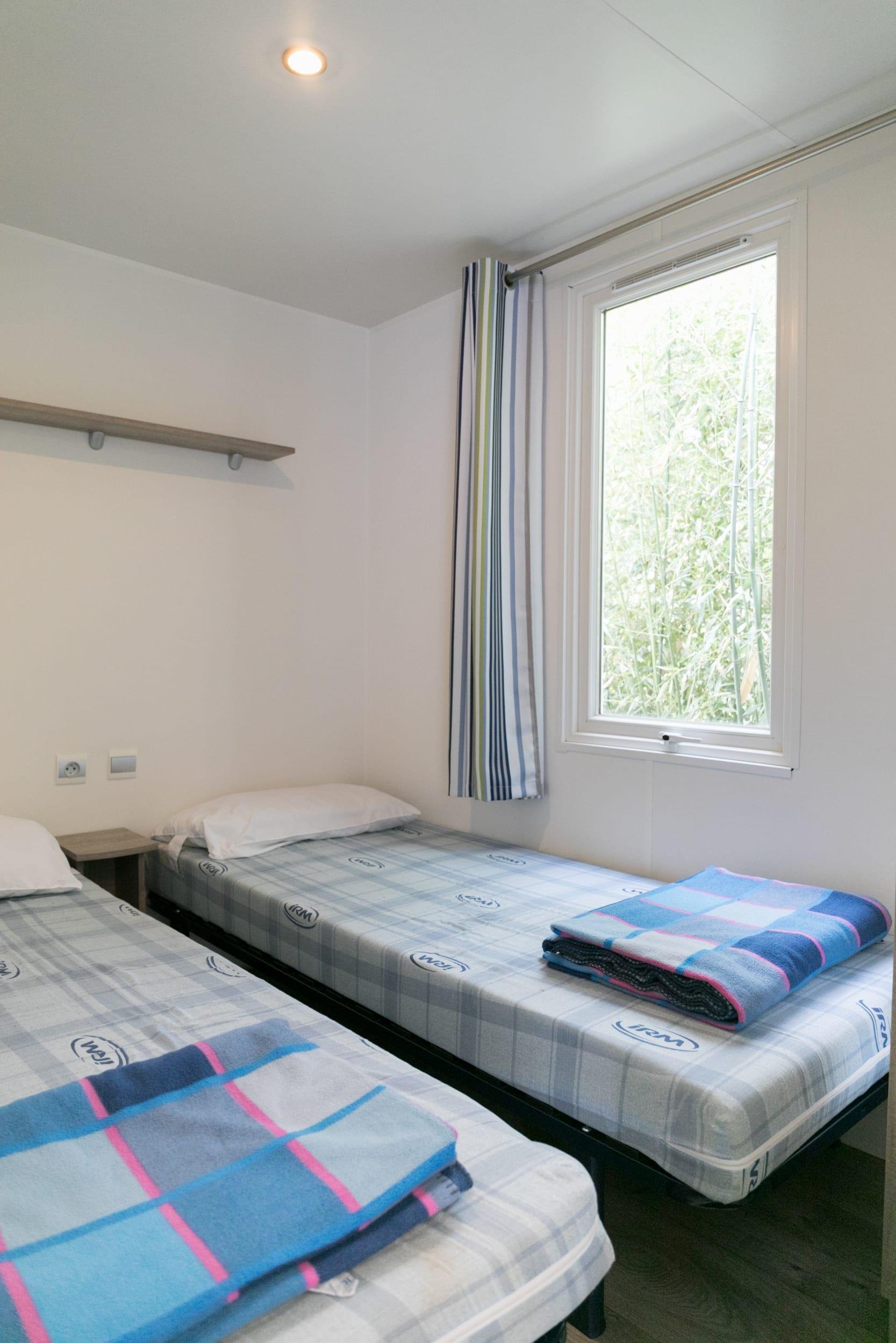 Schlafzimmer: Das Mobilheim hat 3 Schlafzimmer, davon zwei mit getrennten Betten und das andere mit einem Doppelbett. Im Wohnzimmer ist zudem noch eine Schlafcouch für zwei Personen vorhanden.